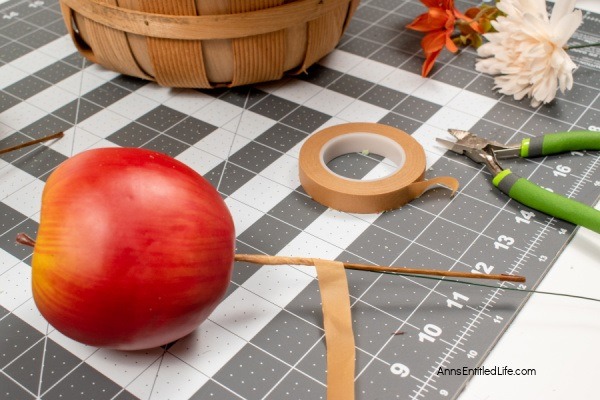 - Once your flowers are placed, add the fruit picks in the same manner. If your stems are too short to reach the foam, you may need to make them longer by wrapping another piece of wire against the original stem with some floral tape.
